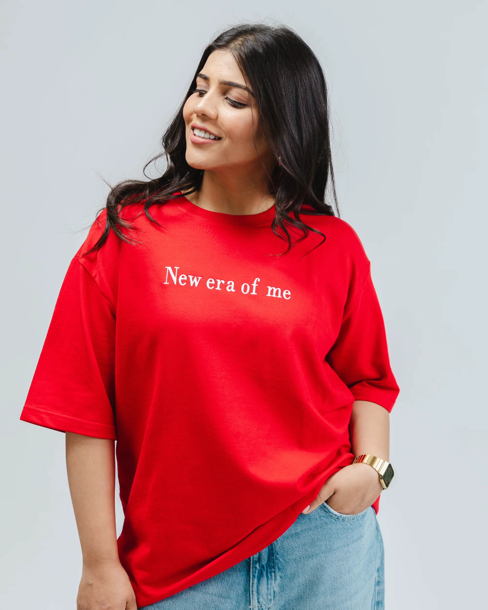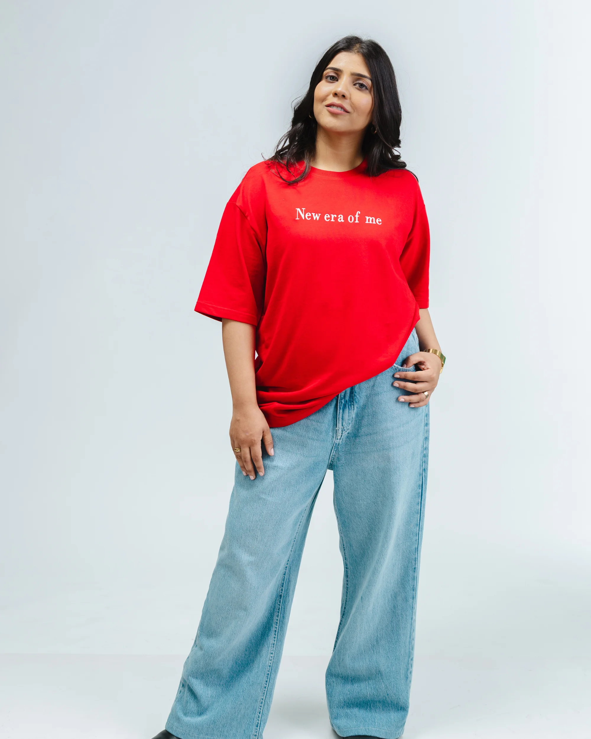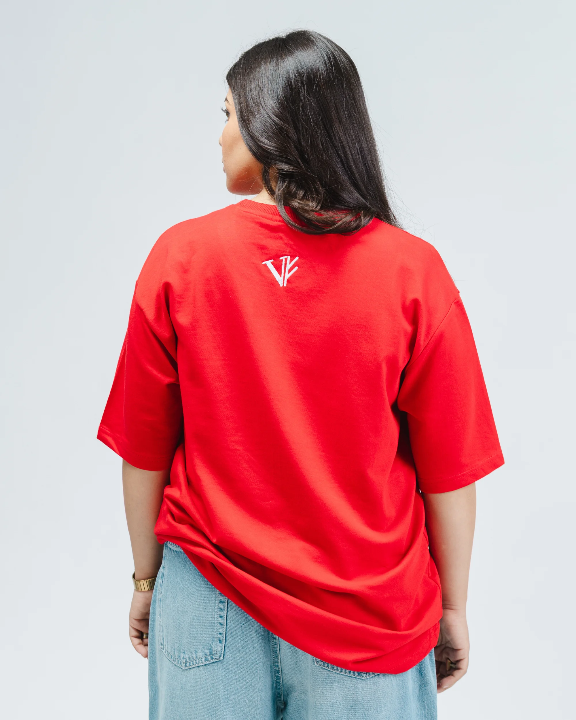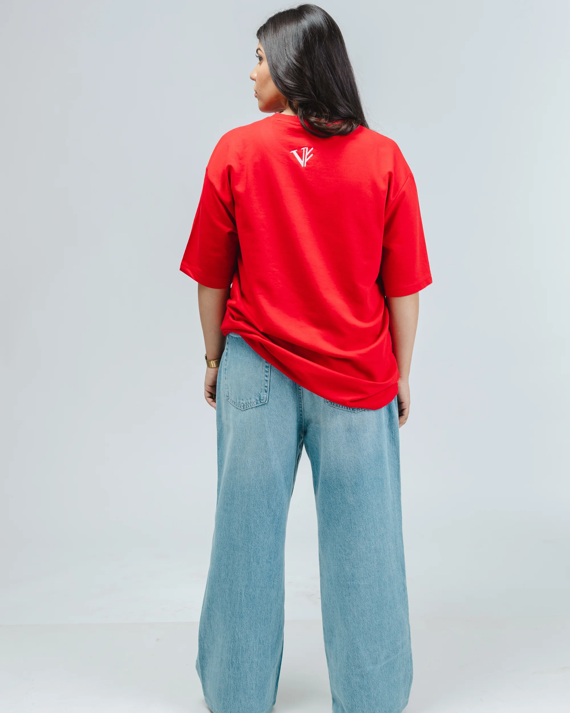 Make a bold statement with this red oversized T-shirt crafted from premium 240 GSM cotton. With its detailed embroidery and relaxed fit, it offers all-day comfort and standout style.